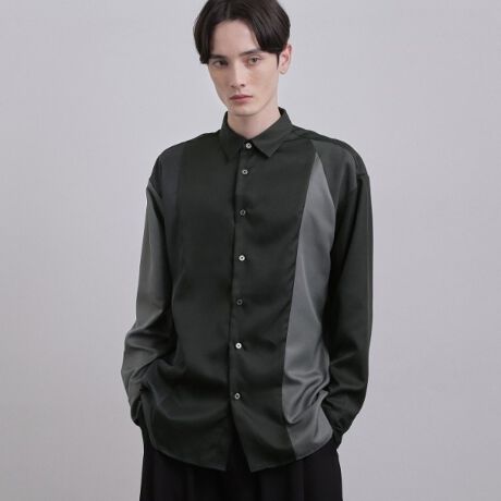 アシンメトリーに配置された、大胆なパネル切り替えが目を惹くデザインシャツ。