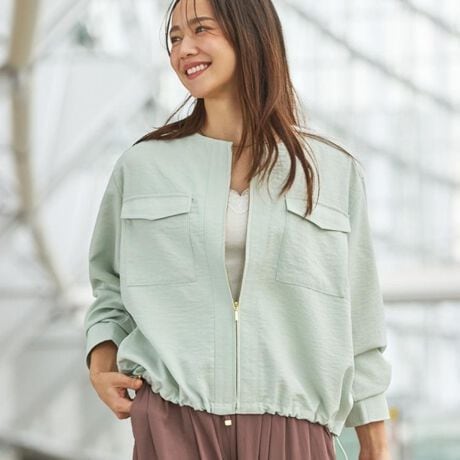 フロントの大きめフラップポケットがポイントのノーカラーブルゾン。