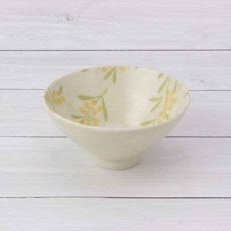 洋風なシュッとしたシェイプに和をかじる釉を掛け、ミモザ模様を撥水絵付けで凹凸感をあしらった器です。