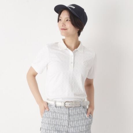 無地見えの半袖ポロシャツは、マリンを思わせるチェーン柄を基にしたデザインで、ブランドロゴやサルーキモチーフがさりげなく配置されています。