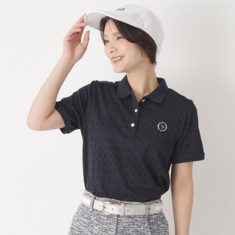 無地見えの半袖ポロシャツは、マリンを思わせるチェーン柄を基にしたデザインで、ブランドロゴやサルーキモチーフがさりげなく配置されています。