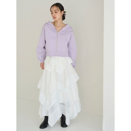 構築的なランダムヘムのティアードフリルレイヤーがふわふわと舞う、華やかなイレヘムティアードスカートです。ティアードの切り替えラインを立体的に大きくとっているので、華やかながらモード感のあるデザイン。カジュアルなスウェットトップスに合わせたカジュアルダウンスタイルや、フィット感のあるニットトップスに合わせたドレッシーなスタイリングもおすすめです。サイドのコンシールファスナーで着脱可能。