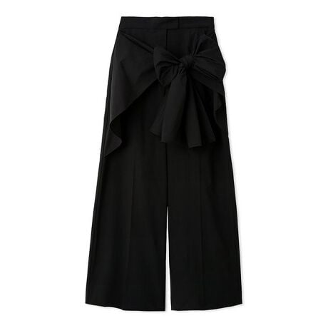 センタープレス入りのストレートワイドパンツの両サイドに、太幅の共布リボンを垂らしてドレープ感を加えたリボンデザインパンツです。サイドの太幅長めのリボンは、フロントでリボン結びや固結びでアレンジ可能。さらに、リボンのサイドにボタンが付いているので、パンツのボタンホールに固定して華やかなラッフルフリルのようにあしらうことも可能です。ウエスト位置はやや太幅ですっきりとしており、美シルエットに着こなしていただけます。ボリュームのあるオフショルタックバルーンブラウス(SWFB261168 ) 合わせのドレッシーなスタイリングにも。サイドにポケット付き。お尻側は飾りポケットです。