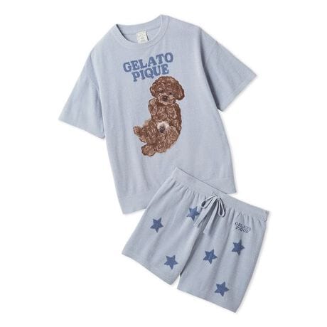 ごろんと寝そべりお腹を見せるワンちゃんが愛くるしい、なめらかでとろけるようなセットアップをONLINE限定でご用意しました。甘えん坊な表情や、ほんのりピンクなお腹の色まで表現した絵柄が、袖を通すたびに心を癒してくれそう。ボトムはキャッチーなスタージャガード入りのショートパンツを合わせました。色は全5色で、トイプードル柄はブルーとピンク、ポメラニアン柄はクリームとベージュ、ビションフリーゼ柄はライトピンクを揃えています。春の新生活へ向けたギフトにもおすすめ。HOMME、JUNIORサイズでも同様のセットアイテムをご用意しています。