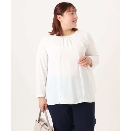 襟ぐりにパールをあしらった、上品で華やかなデザインブラウス。