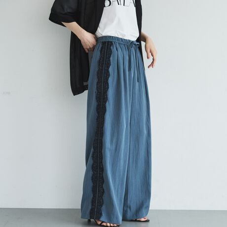 サイドラインにレースをあしらった、華やかなギャザーパンツ