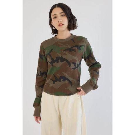 ■ポイント古着ライクなニュアンスの総柄ワッフルトップス。Mサイズはコンパクトめに、Lサイズはゆったりメンズも着用できるユニセックスアイテム。■ディテールワッフル生地に総柄プリントをしています。襟と袖口はフライス仕様です。■スタイリングMサイズはすっきりとしたコンパクトなシルエットなので、シャツやカーディガン、ジップパーカーなどの羽織りのインナーにも大活躍。デニムやハイウエストのボトムにタックインすると、こなれ見えする大人カジュアルコーディネートが完成します。■生地※ONE&ONLYタグ付き生地表面が凹凸していることにより、通気性・吸水性・保温性が高まります。■透け感:なし■裏 地:なし■伸縮性:ややあり■光沢感:なし※お取り扱い上のご注意プリントは着用・洗濯によリ白化、剥離する場合があります。プリント箇所は湿った状態で重ねて放置すると色移りの原因となりますので注意してください。[注意事項]※画像の商品はサンプルです。実際の商品と仕様、加工が若干異なる場合があります。※画像の商品は光の照射や角度、お使いのモニター環境により、実物と色味が異なる場合がございます。※着用、お取り扱いの際は、アテンションタグをご確認ください。