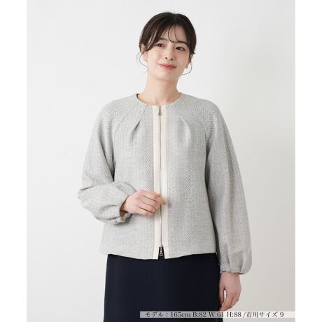 上品なラメを織り込んだ生地が、纏うたびに繊細な煌めきを放つノーカラージャケットです。フロントは開きの調整がお好みで行えるダブルジップ仕様。ネック周りに施されたタックと、後ろ裾に向かってふんわりと広がるフレアシルエットが、大人の女性らしい柔らかな表情を演出。袖口にゴムを入れているので、たくし上げた際にも軽快なニュアンスに。初夏の羽織りに相応しいやや薄手の仕立てながら、裏地付きで滑らかな着心地を叶え、日常のコーディネートを華やかに格上げしてくれる一着です。