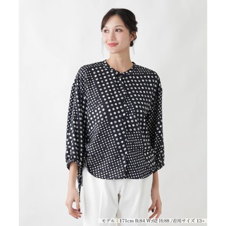 変形ドットとブランドロゴを組み合わせた、オリジナルのプリントが目を惹くブラウス。MUSEならではの遊び心が光る、コーディネートの主役になる一枚です。前開きのデザインで、両脇の裾をリボンで絞ってシルエットのアレンジが可能。透けにくい素材を使用しているため、一枚でも安心して着用いただけます。着こなしに華やかさを添えるアイテムです。