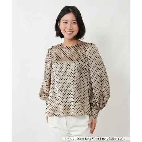 上品な光沢を放つ生地に、クラシカルなドット柄をあしらったエレガントなブラウスです。肩回りに施されたギャザーから流れるようなボリュームスリーブが、手元に向かって優雅な立体感を生み出し、女性らしく柔らかなシルエットを描きます。首元をすっきりと見せるノーカラーのデザインは、一枚での着用はもちろん、ジャケットのインナーとしてもぴったり。薄手でさらりとした質感は初夏の肌に心地よく、デイリーから華やかなシーンまでドラマティックにクラスアップしてくれるトップスです。