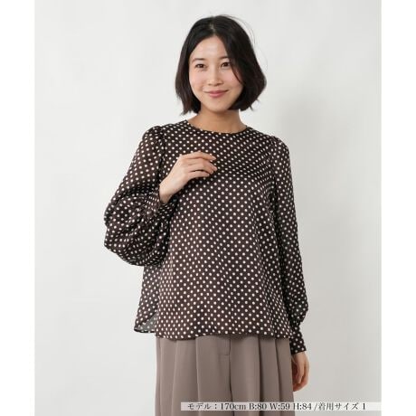 上品な光沢を放つ生地に、クラシカルなドット柄をあしらったエレガントなブラウスです。肩回りに施されたギャザーから流れるようなボリュームスリーブが、手元に向かって優雅な立体感を生み出し、女性らしく柔らかなシルエットを描きます。首元をすっきりと見せるノーカラーのデザインは、一枚での着用はもちろん、ジャケットのインナーとしてもぴったり。薄手でさらりとした質感は初夏の肌に心地よく、デイリーから華やかなシーンまでドラマティックにクラスアップしてくれるトップスです。