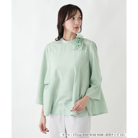 スタンドカラーが上品な印象を与える、「BOURGE」シリーズの七分袖ブラウスです。取り外し可能なコサージュが付属しており、シーンに合わせて華やかさをプラスできます。ジャケットのインナーとしてはもちろん、一枚でもきちんと感があり、着こなしの主役になります。コーディネートの幅を広げてくれる、洗練されたデザインの一枚です。