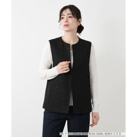 カラフルに煌めくスパンコールを織り込んだツイード生地が、クラス感のある華やぎをもたらすベストです。ノーカラーのすっきりとしたVネックラインと、フロントの鍵ホック仕様により、レイヤードスタイルを端正かつモダンに演出。適度にゆとりを持たせたシルエットは、ブラウスやカットソーの上からさらりと羽織るだけでコーディネートを新鮮にアップデート。初夏の陽光に映える豊かな表情が、日常のスタイルに上品な遊び心を添えてくれます。