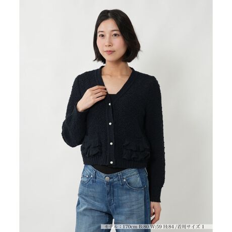 透かし編みが軽やかな抜け感を与える、ショート丈のVネックカーディガンです。フロントには上品なパール調ボタンの光沢が映えるボタンを配し、カジュアルなニットアイテムにクラス感のある女性らしさを添えました。左右のポケットにあしらわれたフリルが、シンプルなシルエットに可憐なリズムとアクセントに。やや薄手で柔らかな肌当たりなので、日差し避けや冷房対策の羽織りとしても重宝し、デニムやワイドパンツと合わせるだけで甘さと大人っぽさが同居するデイリースタイルへと導いてくれます。