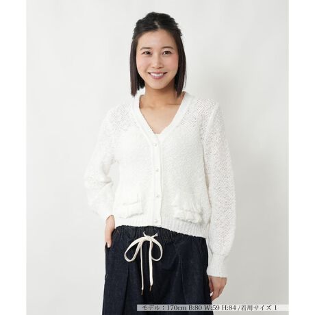 透かし編みが軽やかな抜け感を与える、ショート丈のVネックカーディガンです。フロントには上品なパール調ボタンの光沢が映えるボタンを配し、カジュアルなニットアイテムにクラス感のある女性らしさを添えました。左右のポケットにあしらわれたフリルが、シンプルなシルエットに可憐なリズムとアクセントに。やや薄手で柔らかな肌当たりなので、日差し避けや冷房対策の羽織りとしても重宝し、デニムやワイドパンツと合わせるだけで甘さと大人っぽさが同居するデイリースタイルへと導いてくれます。