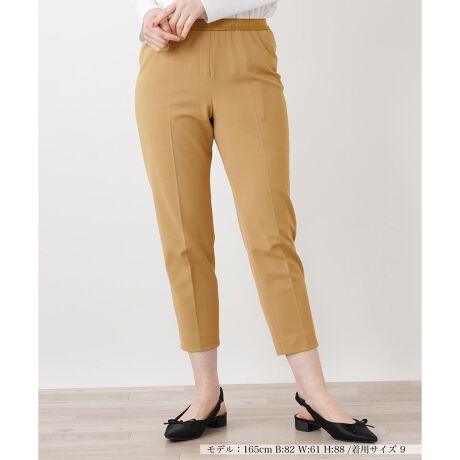 センタープレスを施した端正なシルエットがレッグラインをスマートに引き立てる、軽快なクロップド丈のテーパードパンツ。ウエストの総ゴム部分にあしらわれたラメが、タックインした際のさりげないアクセントに。はっ水性と程よい伸縮性を備えたやや薄手の生地は、肌離れが良くアクティブなシーンにもしなやかにフィット。ポケットを省いたミニマルな仕立てが、お腹周りからヒップにかけてのラインをすっきりと見せ、ストレスフリーな穿き心地と洗練された佇まいを両立した一本です。