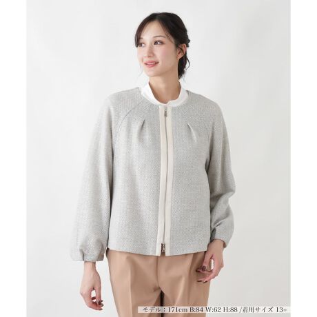 イタリア「NUOVO RIVERA」社の、上品なジャージー素材を使用したノーカラージャケット。微細なラメのきらめきが、装いにさりげない華やかさを添えます。布帛のような見た目ながら、ほどよい伸縮性があり、快適な着心地を実現。顔周りを優しく見せる丸首のデザインは、合わせるインナーを選びません。カジュアルすぎない、大人のタウンスタイルを完成させる一着です。