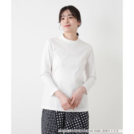 フロントに施された立体的なチェーン刺繍がモダンな遊び心を添えるカットソーです。フランス語で「Tout est possible(すべては可能である)」を意味するポジティブなメッセージが、同系色の糸で上品に表現されています。首元を優しく包むハイネックはラフになりすぎない大人の知的なカジュアルスタイルを演出。心地よい伸縮性を備えたやや薄手の仕立てで肌離れも良く、初夏の爽やかなお出かけにぴったりです。一枚でメインとしてはもちろん、インナーとしてもメッセージ性が光るトップスです。
