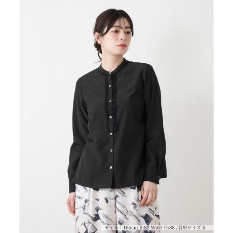 襟周りとフロントに繊細なフリルをあしらい、ほんのり甘いエッセンスを添えたバンドカラーブラウスです。端正な襟型が全体を引き締め、絶妙なバランスのフェミニンスタイルを叶えます。初夏の陽光に透ける軽やかな素材感は、見た目にも涼やかで洗練された佇まいに。バックスタイルにはタックを施し、ふんわりとした柔らかなシルエットを生み出しました。一枚での着用はもちろん、ジャケットのインナーとしても華やかに映えるトップスです。