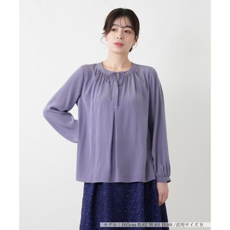 襟元に結ばれた細めのリボンが、柔らかな華やぎを添えるブラウスです。フロントを比翼仕立てにすることで甘くなりすぎず、すっきりとした表情に。全体にギャザーが施された、身体のラインを拾いにくいふんわりとしたリラクシーなシルエットが大人の余裕を演出。初夏の風をはらむような軽やかな薄手の素材感は肌離れも良く、一日中快適な着心地をキープします。一枚でサマになる存在感がありながら、合わせるボトムスを選ばない汎用性の高いトップスです。