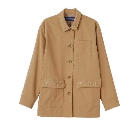 オーセンティックなステンカラーに、現代的なエッセンスを添えたショートコート。やや薄手で軽やかな素材感は、柔らかな陽光が降り注ぐ春の羽織りに相応しく、クリーンな品格を与えます。襟と腰ポケットのフラップにあしらわれたホットフィットはスタッズほど主張しすぎず、控えめながらも確かな光沢を放つ装飾のバランスが絶妙。比翼仕立てのフロントやべっ甲調のボタンといった細部へのこだわりが、大人の女性にふさわしい佇まいを演出。パンツスタイルでマニッシュに、あるいはスカートと合わせてフェミニンにと多彩なコーディネートにマッチします。