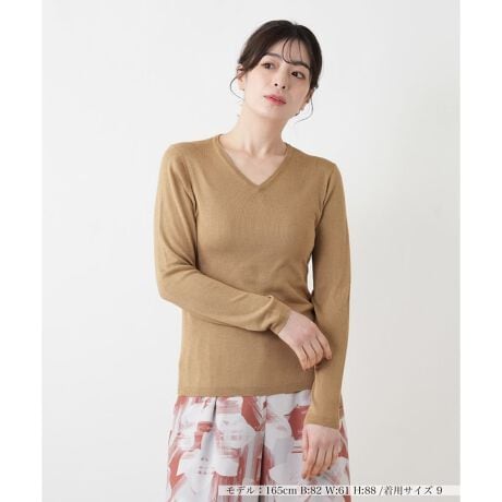 シルクならではの滑らかな肌触りと上品な光沢が、大人の日常に贅沢な心地よさをもたらすリブ編みのニットトップス。デコルテを美しく見せる絶妙な開きのVネックが、顔周りをすっきりとシャープな印象に。程よく身体にフィットするシルエットは、一枚での着用はもちろん、ジャケットのインナーとしても重宝します。初夏のコーディネートに相応しい軽やかな薄手のニットで、カジュアルなボトムスと合わせても洗練された佇まいに仕上がる一枚です。