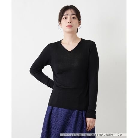 シルクならではの滑らかな肌触りと上品な光沢が、大人の日常に贅沢な心地よさをもたらすリブ編みのニットトップス。デコルテを美しく見せる絶妙な開きのVネックが、顔周りをすっきりとシャープな印象に。程よく身体にフィットするシルエットは、一枚での着用はもちろん、ジャケットのインナーとしても重宝します。初夏のコーディネートに相応しい軽やかな薄手のニットで、カジュアルなボトムスと合わせても洗練された佇まいに仕上がる一枚です。