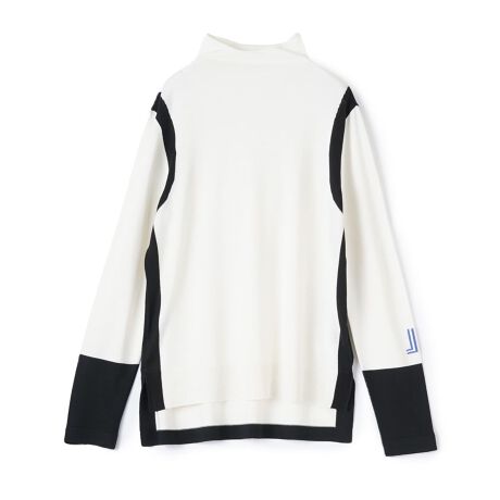 シンプルな天竺編みをベースに、脇線からアームホールにかけてインターシャ編みで配色ラインを入れ、シャープでモダンな印象に。