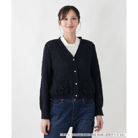 立体感のある編み地が、豊かな表情を演出します。両サイドのポケットには、質感の異なる生地で仕立てたフリルが重ねられ、華やかなアクセントを添えています。フロントに並んだ小粒のパール調ボタンが、上品な輝きをプラス。袖口と裾はリブで切り替えることで、全体のシルエットを心地よく引き締めています。