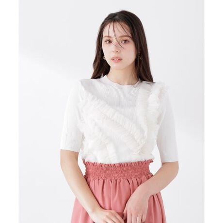 前身頃にチュールフリルをふんだんにあしらった華やかなニット。シンプルなボトムと合わせるだけでバランス良く決まり、一枚でコーディネートを華やかに見せてくれます。フェミニンなスカート、カジュアルなデニムコーデもおすすめ。ニュアンスカラーも魅力のアイテムです。