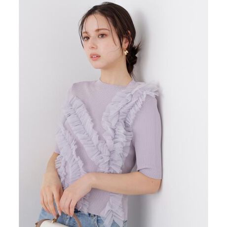前身頃にチュールフリルをふんだんにあしらった華やかなニット。シンプルなボトムと合わせるだけでバランス良く決まり、一枚でコーディネートを華やかに見せてくれます。フェミニンなスカート、カジュアルなデニムコーデもおすすめ。ニュアンスカラーも魅力のアイテムです。