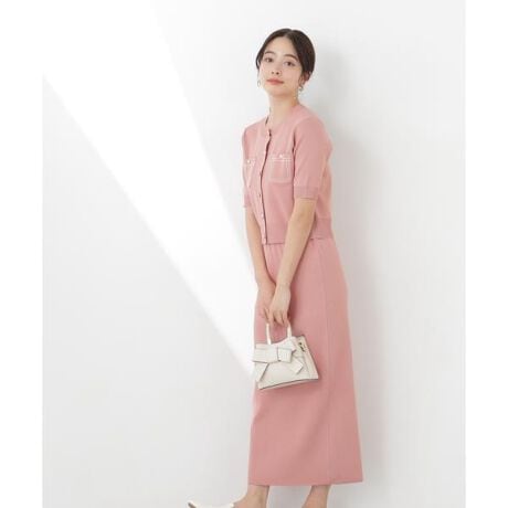ステッチ刺しゅうがアクセントの半袖ニットカーディガンと、ナローシルエットのニットスカートの上品セットアップ。カーディガンはきらりと光るメタルボタンがクラシカルで大人可愛い印象を演出。スカートは後ろスリット入りで歩きやすくなっています。単品使いもでき、デートやお出かけ、オフィスシーンにも活躍してくれます。