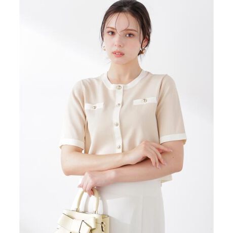 春先に一枚は持っておきたいバイカラーニットカーディガン。リボンタイバイカラーニットワンピース(ブランド品番121-6140306)にさらっと羽織ったり、前を閉じてプルオーバー風に着こなし、デニムと合わせたキレイめカジュアルスタイルもおすすめです。清涼感のある糸を使用しており、春先まで長く着用いただけます。