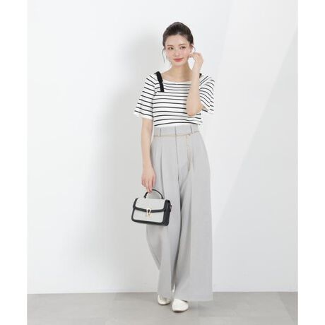チェーンベルトがアクセントの大人可愛いワイドパンツ。センタープレスで脚のラインをすっきり見せ、キレイなシルエットを叶えます。高めウエストと後ろゴムでスタイルアップし、快適なはき心地です。後ろポケットは飾り仕様で、シルエットを崩さず上品に。カジュアルにもキレイめにも使える万能フェミニンパンツです。