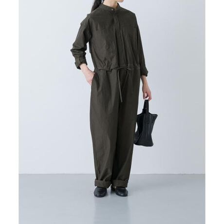 簡単にコーディネートが完成するオールインワン。ゆとりがあるサイズ感で体の線を拾いにくいのも嬉しいポイント。アクセサリーや小物が映えるシンプルなデザインは、お出かけ気分を高めます。少し釦を開けて着用すると抜け感が増した装いに。ウエストの紐でブラウジングしたり、裾をロールアップすれば着丈の調節も可能です。