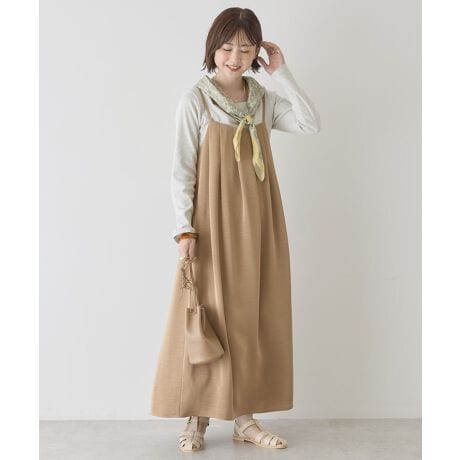 フロントのタックと微光沢のサテンが上品で重厚感のあるキャミワンピース。マキシ丈のIラインシルエットで身体のラインを拾わず、すっきりとスタイルアップが叶います。滑らかな肌触りと美しいドレープがフェミニンなムードをプラス。ストラップは長さ調節可能で、シアーインナーやニットとのレイヤードもおすすめです。透け感[なし]