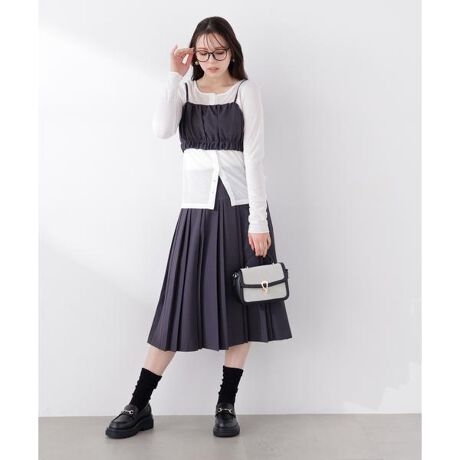 上品な揺れ感が女性らしさを引き立てるミディ丈プリーツスカート。ソックス合わせでトレンド感をプラスしたり、同素材のビスチェとセットアップでこなれた印象に。レイヤード風カーディガン(ブランド品番121-6176300)とのスタイリングも相性抜群で、旬なコーディネートが完成します。