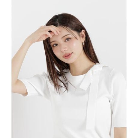トレンドのサイドリボンを取り入れた大人フェミニンなニット。控えめで形が整ったリボンなので、気軽にデイリー使いできます。無地のエクリュとピンクに加えて、配色のモノトーンカラーもおすすめです。