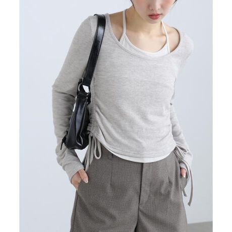 ホルターネックインナーとドッキングしたようなデザインカットソー。ホルター部分は柔らかい肌触りのフライス素材でアウター側、柔らかいタッチのリブカットソー素材です。胸部分でドッキングされており、1枚でスタイリングが完成するデザイン。両脇のドロストで着丈を調整できます。身頃も袖もフィットするコンパクトなサイジングです。フィットするサイジングなのでデニム合わせでラフな着こなしがバランスが取りやすいです。ミニスカート合わせで韓国っぽい着こなしもおすすめです。※モデルの着用画像の場合、光の当たり具合により、実際の色味と異なって見えることがございます。色味は、商品単体の画像をご参照ください。