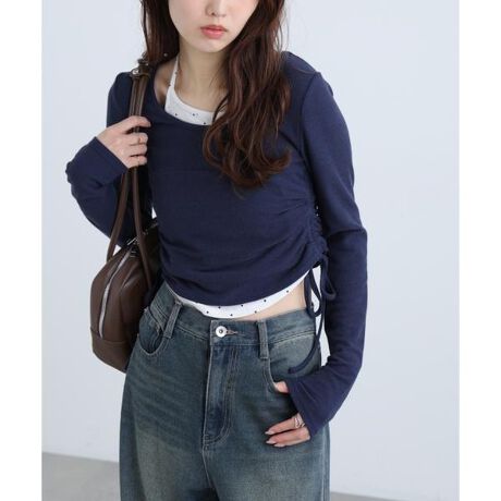 ホルターネックインナーとドッキングしたようなデザインカットソー。ホルター部分は柔らかい肌触りのフライス素材でアウター側、柔らかいタッチのリブカットソー素材です。胸部分でドッキングされており、1枚でスタイリングが完成するデザイン。両脇のドロストで着丈を調整できます。身頃も袖もフィットするコンパクトなサイジングです。フィットするサイジングなのでデニム合わせでラフな着こなしがバランスが取りやすいです。ミニスカート合わせで韓国っぽい着こなしもおすすめです。※モデルの着用画像の場合、光の当たり具合により、実際の色味と異なって見えることがございます。色味は、商品単体の画像をご参照ください。
