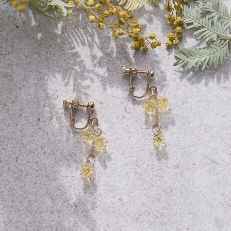 定番の「ミモザ」とは少し雰囲気を変えて、オレンジや黄色の色味が入ったガラスが耳元で可憐に揺れるデザイン。