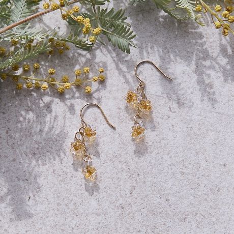 定番の「ミモザ」とは少し雰囲気を変えて、オレンジや黄色の色味が入ったガラスが耳元で可憐に揺れるデザイン。