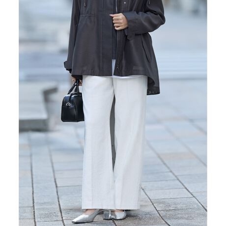 ■デザインセンタープレス入りのワイドパンツです。ウエスト部分にゴムを内蔵させたスマートバック仕様で、ラクな穿き心地ながらトップスINもきれいに決まります。また、ノータックでウエスト回りもすっきりとした印象に。トップスを選ばず、通勤にも休日のお出かけなど幅広いシーンで活躍する万能アイテムです。