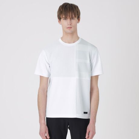フロントをパッチワーク状に切り替えたTシャツ。部分的にチェック柄や凹凸感のある素材を取り入れる事でさり気ないアクセントに。同系色でまとめながらも、程良いデザイン性により一枚でも存在感あるTシャツに仕上がっています。
