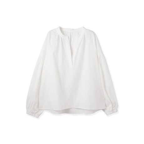 ギャザーを寄せたドロップショルダーデザインで袖口をゴム仕様にすることで、袖をたくし上げた際に、よりふんわりとしたボリューム感の感じられる着こなしに。