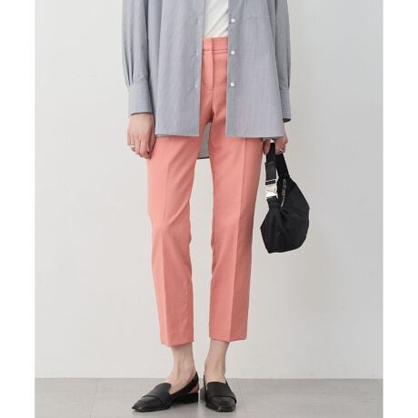 ■デザインやや浅めに股上を設定したパターンで腰回りにボリュームが出にくく、スッキリ見えが叶うスティックパンツです。センタープレス入りでタテのラインが強調され、美脚見えが期待できます。またウエスト部分後ろにゴムを内蔵したスマートバック仕様なのも嬉しいポイント。 ジャケットやシャツ合わせで通勤にも、ラフなニット合わせで休日にも活躍します。 オフホワイト(002)は裏地にパワーネットを使い透けにくい仕様にしています。