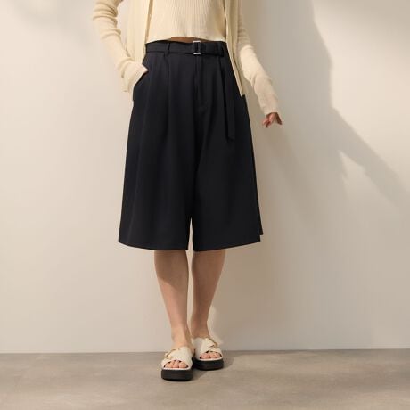 メタルカラーバックルの共布イージーベルト付きのバミューダパンツは2タックデザインでクリーンな表情で端正な大人顔です。