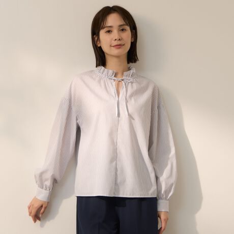 襟もとの立体感のあるフリルでフェミニン要素をプラスしながら、キーネック、ドロップショルダーデザインで、程よく抜け感を演出します。