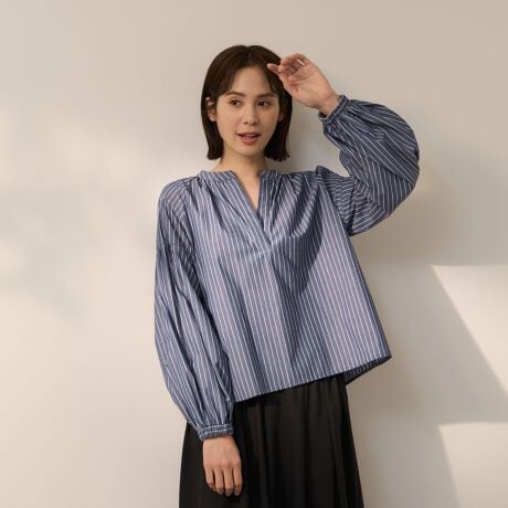 ギャザーを寄せたドロップショルダーデザインで袖口をゴム仕様にすることで、袖をたくし上げた際に、よりふんわりとしたボリューム感の感じられる着こなしに。