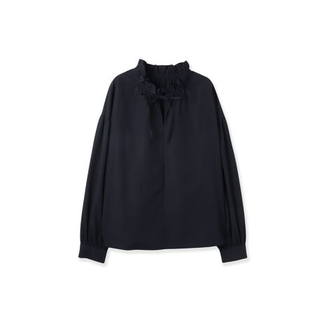 襟もとの立体感のあるフリルでフェミニン要素をプラスしながら、キーネック、ドロップショルダーデザインで、程よく抜け感を演出します。